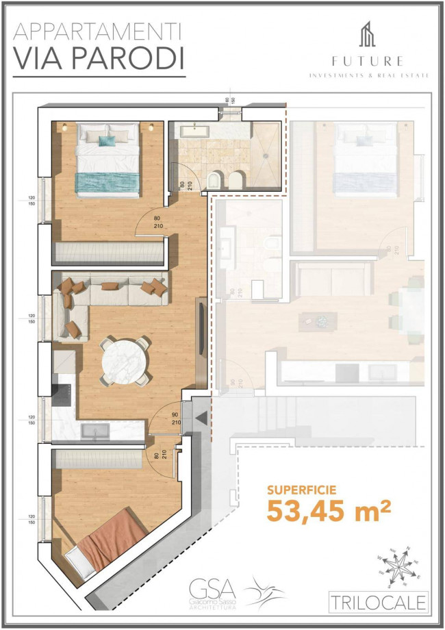 Le immagini di rendering sono a scopo puramente illustrativo e pubblicitario e non costituiscono elemento contrattuale, i costi relativi agli arredi saranno forniti su richiesta, qualora di interesse per la clientela.